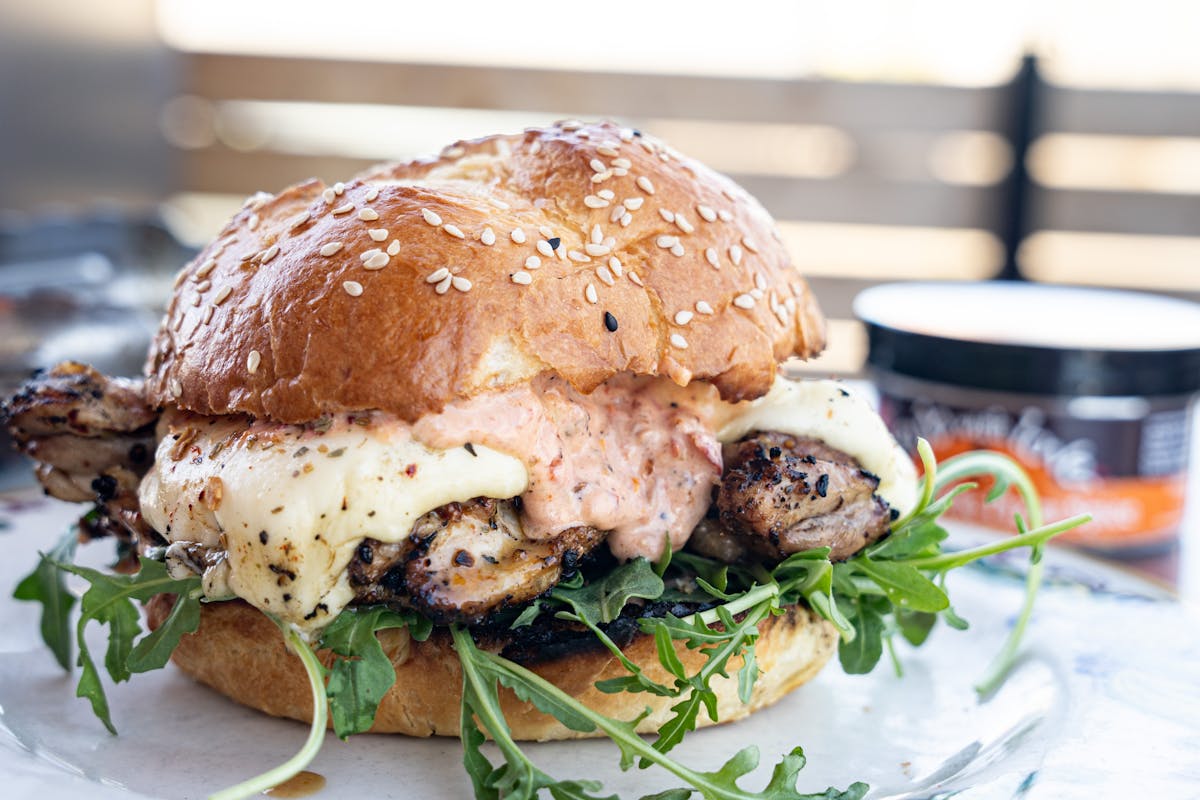 - Top with arugula, then chicken, the top bun.